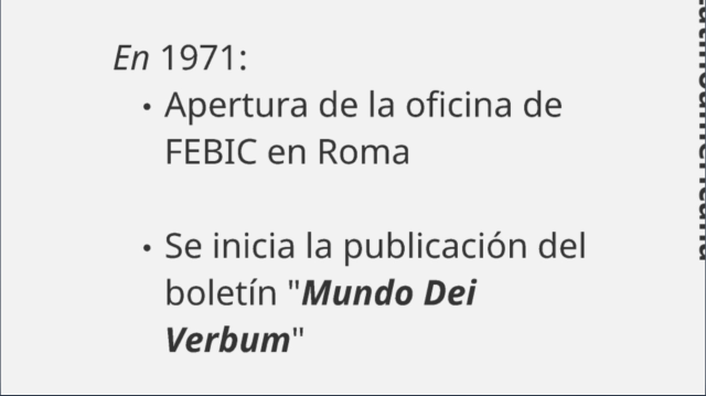 «Si todo el trabajo bíblico que está realizando en América Latina y el Caribe fue y es apadrinado y auspiciado por el documento de la DEI VERBUM que constituyó el apoyo oficial a una manifestación del Espíritu Santo como fue en los años 60 el incipiente trabajo bíblico realizado por pioneros de aquella época, así como ese acercamiento innovador a la Biblia en los años previos al Concilio fue avalado, promocionado e impulsado por este documento sobre la Palabra de Dios, de la misma manera podemos decir que la existencia de la FEDERACIÓN BÍBLICA CATÓLICA es fruto y consecuencia de la DEI VERBUM.