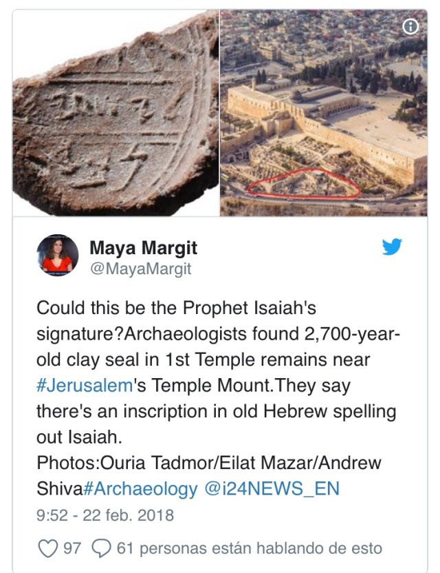 Eilat Mazar, quien es uno de los profesores que lidera dicha investigación, explicó que en la impresión del sello se puede ver el nombre de Isaías —’Yesha’yahu’, en hebreo—, pero aún no están del todo seguros de que este perteneciera al profeta.
