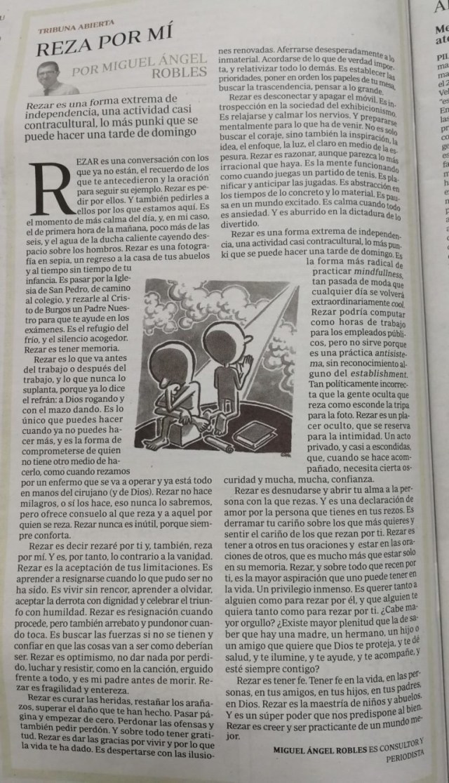 «Rezar es una conversación con los que ya no están, el recuerdo de los que te antecedieron y la oración para seguir su ejemplo. Rezar es pedir por ellos. Y también pedirles a ellos por los que estamos aquí. Es el momento de más calma del día, y, en mi caso, el de primera hora de la mañana, poco más de las seis, y el agua de la ducha caliente cayendo despacio sobre los hombros. Rezar es una fotografía en sepia, un regreso a la casa de tus abuelos y al tiempo sin tiempo de tu infancia. Es pasar por la Iglesia de San Pedro, de camino al colegio, y rezarle al Cristo de Burgos un Padre Nuestro para que te ayude en los exámenes. Es el refugio del frío, y el silencio acogedor. Rezar es tener memoria.