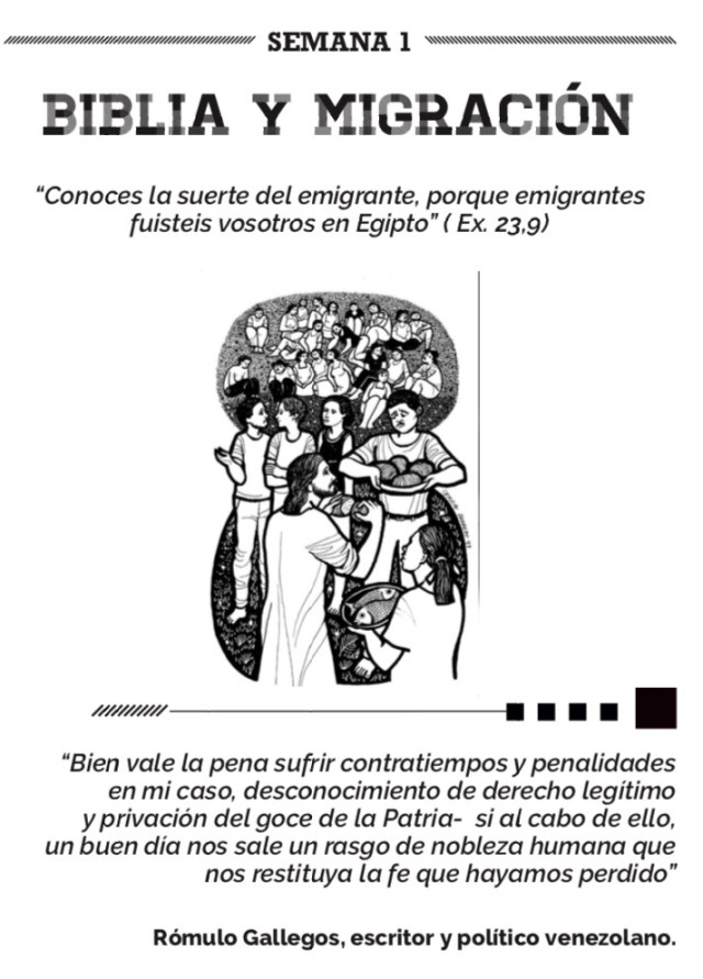 Este subsidio bíblico pensado para las comunidades cristianas ofrece cada semana desde distintos textos bíblicos luces para vivir esta situación tan dolorosa de la migración forzada a la luz de nuestra fe, según el modelo de Jesús, extranjero en medio de los extranjeros y de las primeras comunidades cristianas quienes en su ímpetu misionero, nos enseñaron que nuestra verdadera ciudadanía es la del cielo y por eso a pesar del sufrimiento del desarraigo y la migración sabemos que es una realidad relativa frente al absoluto que es la vida con Dios y la instauración de la Ciudad Santa donde no habrá ni muros ni barreras.