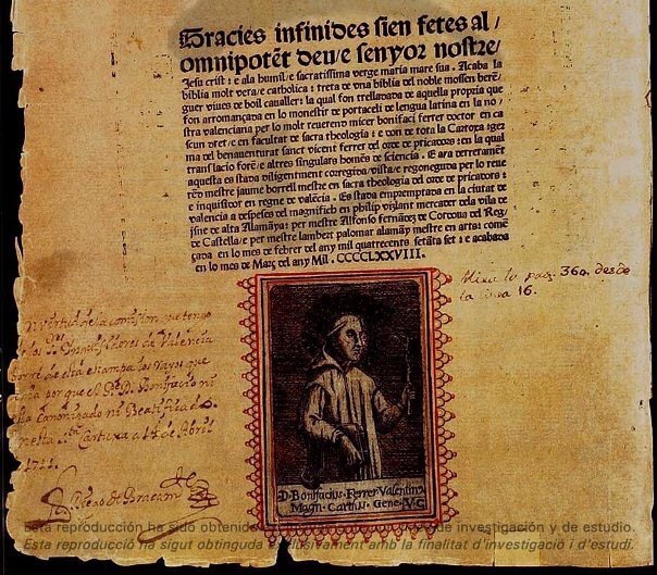 «Gracias infinitas sean dadas al Omnipotente Dios y Señor Nuestro Jesucristo y a la humilde y sacratísima Virgen Madre suya. Acaba la Biblia muy verdadera y católica, sacada de una biblia del noble mosén Berenguer Vives de Boil, caballero [mosén era en la época un título de nobleza, no eclesial; nota del redactor], la cual fue trasladada de aquella propia que fue arromanzada en el monasterio de Portaceli de lengua latina a la nuestra valenciana por el muy reverendo señor Bonifaci Ferrer, doctor en cada Derecho y en Facultad de Sacra Teología, y don de toda la Cartuja; hermano del bienaventurado San Vicente Ferrer, del Orden de Predicadores, en cuya traducción hubo otros singulares hombres de ciencia.