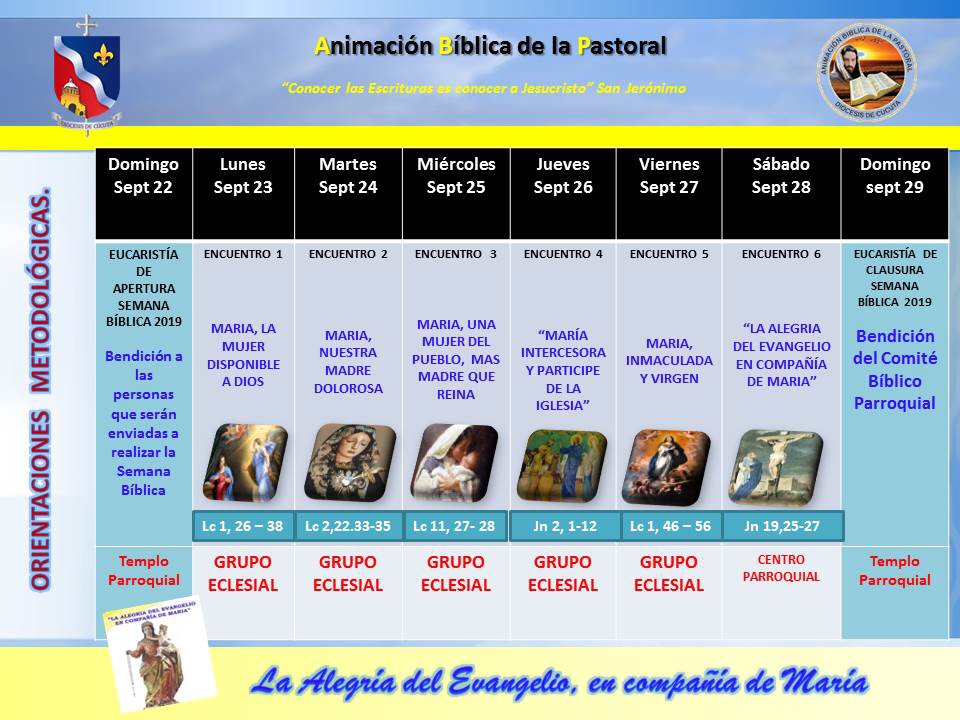 “Se invita a todas las parroquias a continuar el trabajo de Animación Bíblica de la Pastoral con el material diseñado en los grupos eclesiales, colegios, centros comerciales, en cada ambiente donde nos desenvolvemos y a seguir poniendo en el centro de la evangelización La Palabra, para que sea corazón de la vida de la Iglesia y de la vida pastoral como lo expresó el papa Francisco audiencia a los participantes del Congreso internacional de la FEBIC (Federación Bíblica Internacional) el 26 de abril de 2019: “Pero no podemos renunciar a la Palabra de Jesús, la única Palabra de vida eterna (cfr. Jn 6,68), que necesitamos todos los días. Sería hermoso que floreciera” una nueva etapa de mayor amor a la Sagrada Escritura por parte de todos los miembros del Pueblo de Dios, de manera que se profundice la relación con la persona misma de Jesús» (Exhortación Apostólica Verbum Domini, 72). Sería bueno que la Palabra de Dios se convirtiera en “el corazón de toda actividad eclesial” (Exhortación Apostólica Evangelii Gaudium, 174); corazón que late, que vitaliza las extremidades del cuerpo. Es deseo del Espíritu plasmarnos como Iglesia en “formato -Palabra”: una Iglesia que no habla de sí misma o por sí misma, sino que lleva en su corazón y en sus labios al Señor, que diariamente recurre a su Palabra. En cambio, la tentación es siempre la de anunciarnos y de hablar sobre nuestras dinámicas, pero así la vida no se transmite al mundo”.