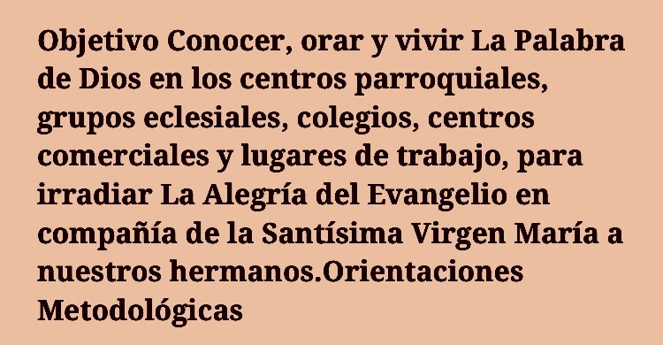 “Objetivo Conocer, orar y vivir La Palabra de Dios en los centros parroquiales, grupos eclesiales, colegios, centros comerciales y lugares de trabajo, para irradiar La Alegría del Evangelio en compañía de la Santísima Virgen María a nuestros hermanos.“