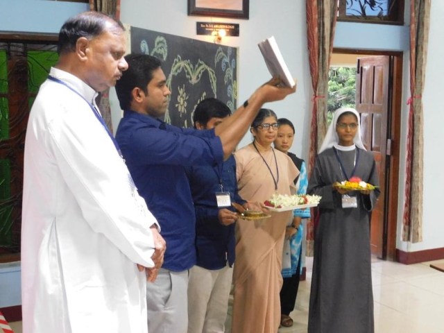 At 4.30 pm the Prayer Service with the enthronement of the Bible and lighting of the lamp by the dignitaries marked the inauguration and Fr Sagaya John, the director of the NBCLC welcomed the dignitaries (Most Rev. Antonysamy Peter Abir, Chairman of the Bible Commission; Most Rev. T. Joseph Raja Rao, Member Bishop of the Commission; Rev. Fr. A. John Baptist, Executive Secretary, Bible Commission; Rev. Fr. Assisi Saldanha, President, TPI; Rev. Fr. Joy Philip, President, CBAI; Rev. Fr. Stephen Alathara, Deputy Secretary, CCBI; Rev. Fr. Selva Ratinam, Resource Person) and participants.