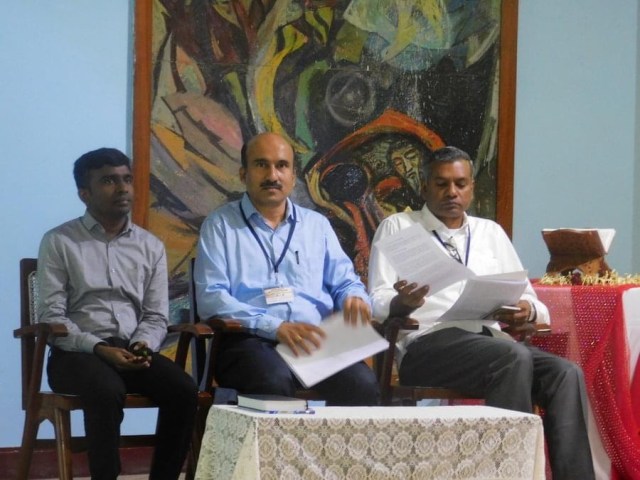 The second day began with the Holy Eucharist presided over by Bishop Peter Abir. After breakfast the input sessions under various topics: “Narrative-Rhetoric and Canonical Methods for the Interpretations of the Bible (Synchronic Approach)” (Fr. Joy Philip CMI, (DVK, Bangalore, the president of CBAI)); “Hope amidst Hopelessness: Subaltern Approaches to the Markan World” (Fr. Maria Arulraja SJ); “Feminist Biblical Scholarship – Before and After the (document) Interpretation of the Bible in the Church” (Sr. Prema Vakayil, CSST, Mysore); “Pastoral Methods used in the Interpretation of the Bible” (Fr Mario Mendes, Mumbai); “Inter-Textual Reading of the Bible with the Sacred Scriptures of other Indian Belief Traditions” (Mr Shilanand Hemraj, Bangalore).