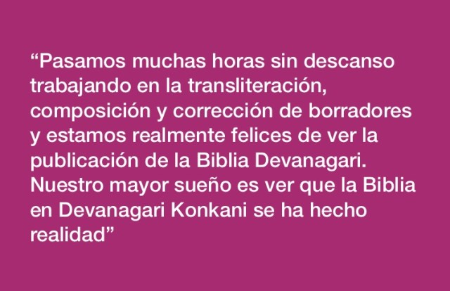 Por su parte el Padre D’Mello expresó: “Pasamos muchas horas sin descanso trabajando en la transliteración, composición y corrección de borradores y estamos realmente felices de ver la publicación de la Biblia Devanagari. Nuestro mayor sueño es ver que la Biblia en Devanagari Konkani se ha hecho realidad”.