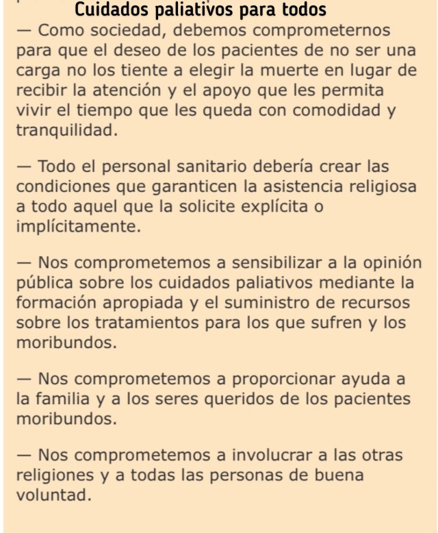 Pero “la mayoría de las decisiones concernientes al paciente terminal no son de naturaleza médico-científica. Más bien, se basan en valores personales y éticos. Por lo tanto, el cuidado del paciente terminal tanto por parte de las familias como por el personal sanitario, es una tarea difícil, teniendo también en cuenta cuales son las costumbres sociales”.https://www.aceprensa.com/m/articles/cristianos-judios-y-musulmanes-contra-la-eutanasia-y-favor-de-los-cuidados-palia/