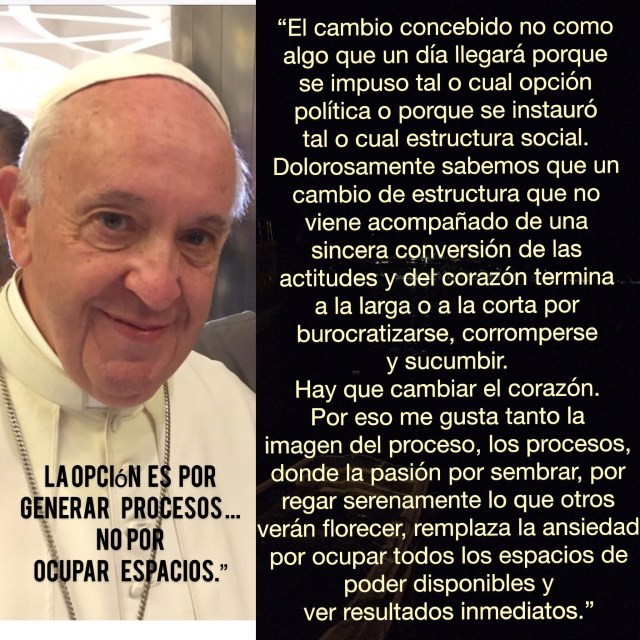 “El cambio concebido no como algo que un día llegará porque se impuso tal o cual opción política o porque se instauró tal o cual estructura social. Dolorosamente sabemos que un cambio de estructuras que no viene acompañado de una sincera con-versión de las actitudes y del corazón termina a la larga o a la corta por burocratizarse, corromperse y sucumbir. Hay que cambiar el corazón. Por eso me gusta tanto la imagen del proceso, los procesos, donde la pasión por sembrar, por regar serenamente lo que otros verán florecer, remplaza la ansiedad por ocupar todos los espacios de poder disponibles y ver resultados inmediatos. La opción es por generar procesos y no por ocupar espacios.” (09/07/2015, Expocruz).https://www.iglesiaviva.net/2019/11/14/sobre-lo-que-hemos-vivido-en-bolivia-estos-dias/