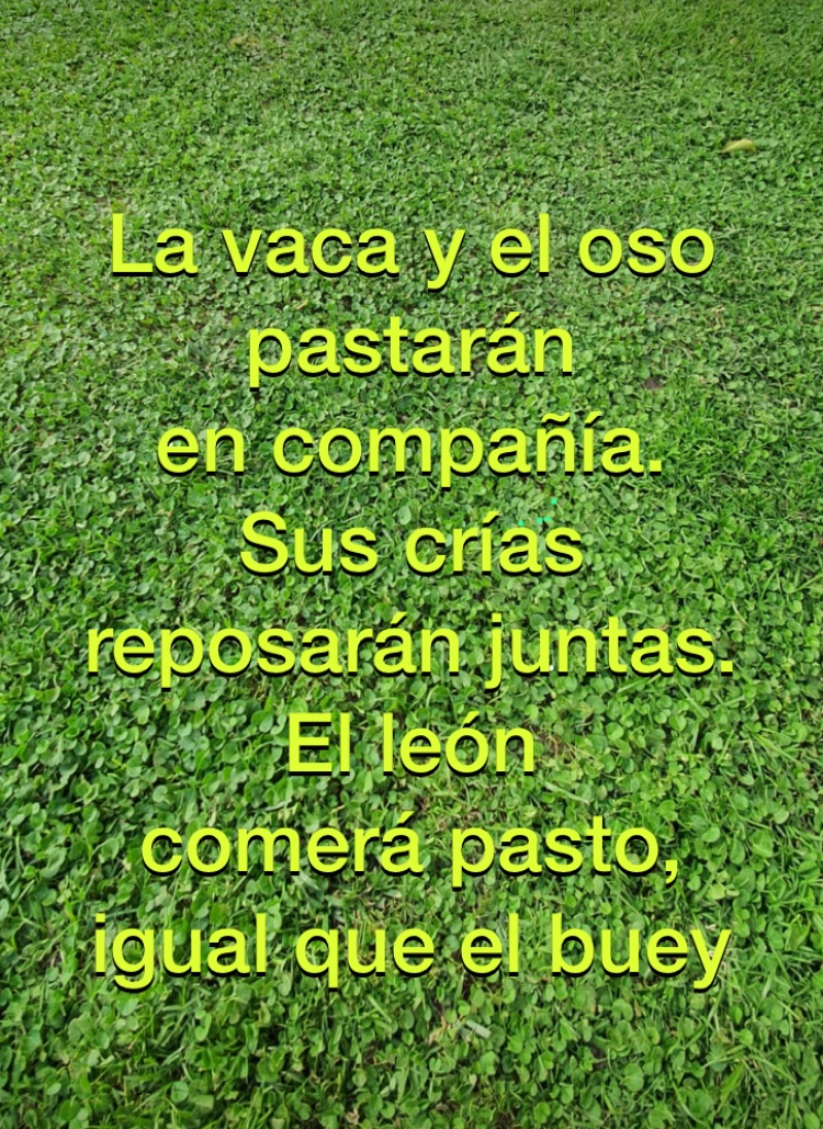 “El lobo habitará con el cordero, el puma se acostará junto al cabrito, el ternero comerá al lado del león y un niño chiquito los cuidará.