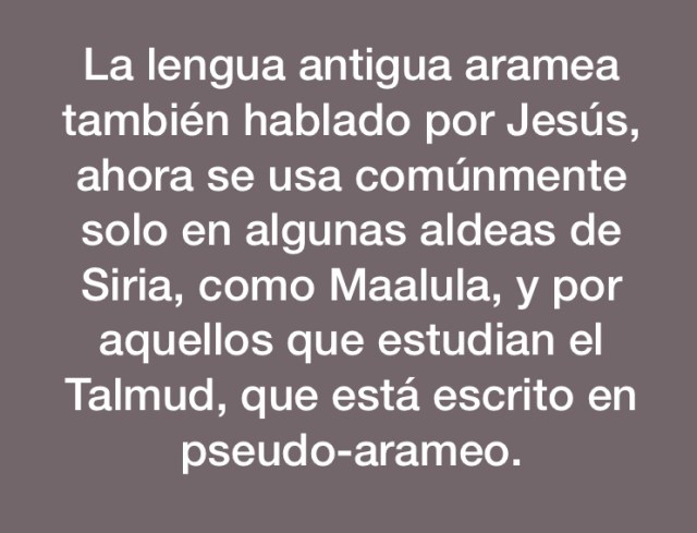 La lengua antigua aramea también hablado por Jesús, ahora se usa comúnmente solo en algunas aldeas de Siria, como Maalula, y por aquellos que estudian el Talmud, que está escrito en pseudo-arameo.