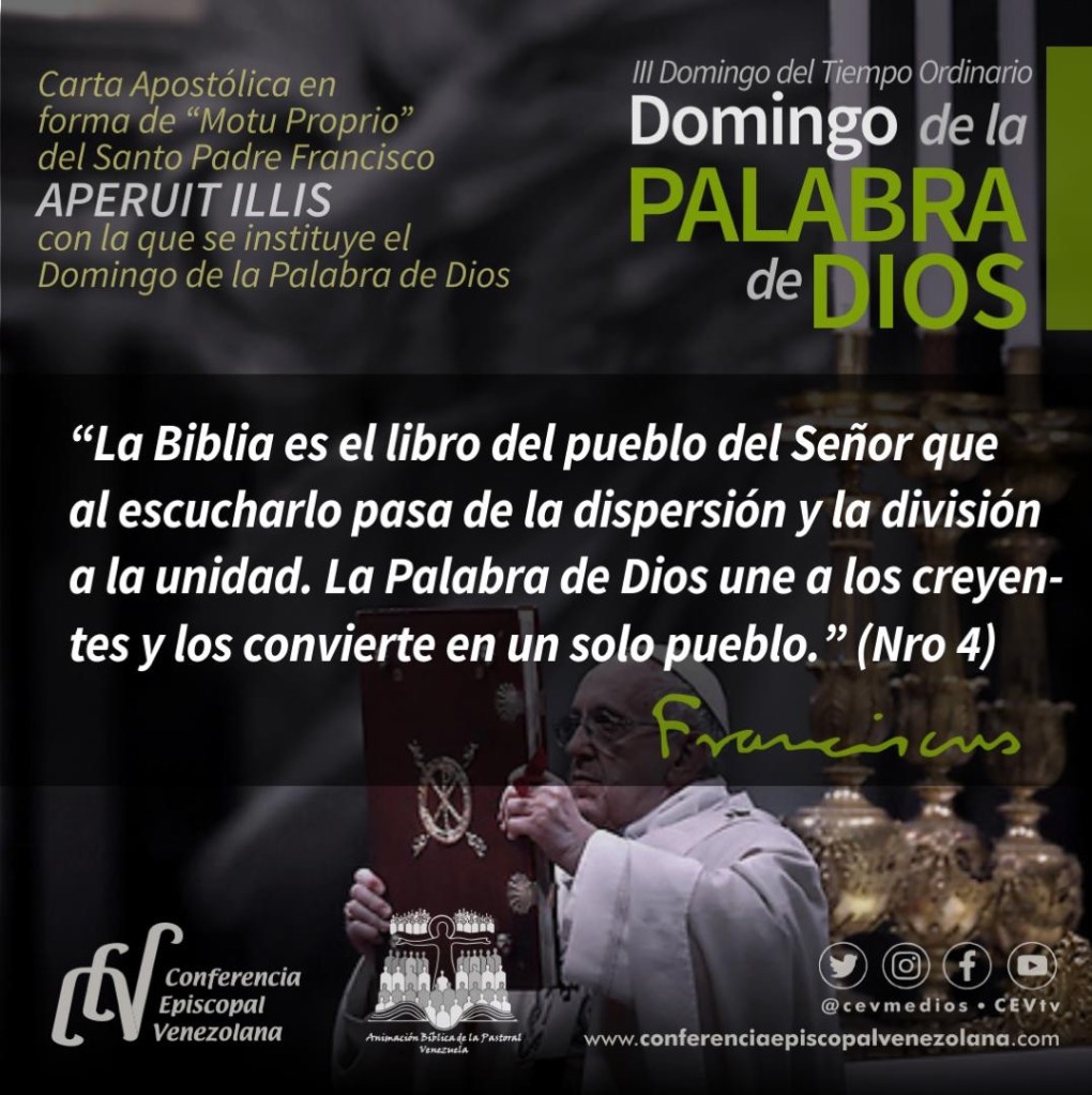 Caracas– «Que el III Domingo del Tiempo Ordinario esté dedicado a la celebración, reflexión y divulgación de la Palabra de Dios. Este Domingo de la Palabra de Dios se colocará en un momento oportuno de ese periodo del año, en el que estamos invitados a fortalecer los lazos con los judíos y a rezar por la unidad de los cristianos«, lo establece el Papa Francisco en su Carta Apostólica en forma Motu Proprio «Aperuit Illis», con la que instituye el Domingo de la Palabra de Dios, documento que fue publicado este 30 de septiembre, en la memoria litúrgica de San Jerónimo en el inicio del 1600 aniversario de su muerte.