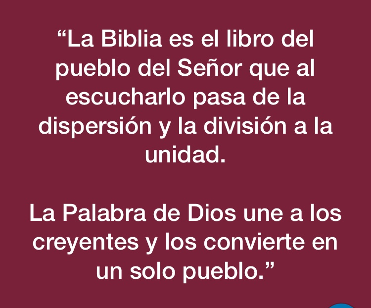 Estas palabras contienen una gran enseñanza. La Biblia no puede ser sólo patrimonio de algunos, y mucho menos una colección de libros para unos pocos privilegiados. Pertenece, en primer lugar, al pueblo convocado para escucharla y reconocerse en esa Palabra. A menudo se dan tendencias que intentan monopolizar el texto sagrado relegándolo a ciertos círculos o grupos escogidos. No puede ser así. La Biblia es el libro del pueblo del Señor que al escucharlo pasa de la dispersión y la división a la unidad. La Palabra de Dios une a los creyentes y los convierte en un solo pueblo.