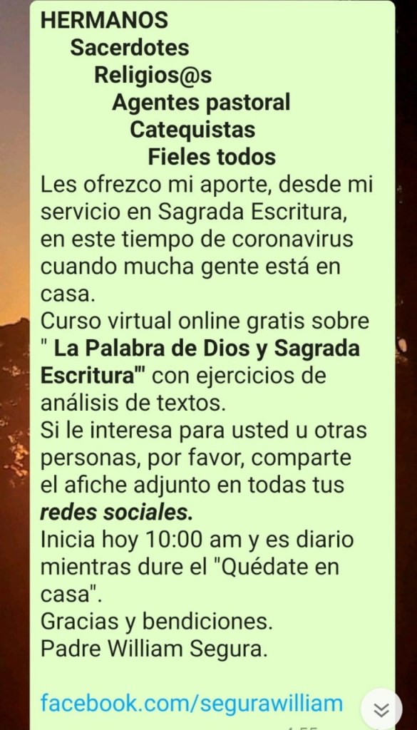 El Padre William Segura, desde Costa Rica, ofrece un Curso virtual on-line gratis sobre La Palabra de Dios y Sagrada Escritura» con ejercicios de análisis de textos, mientras dure el «Quédate en casa»