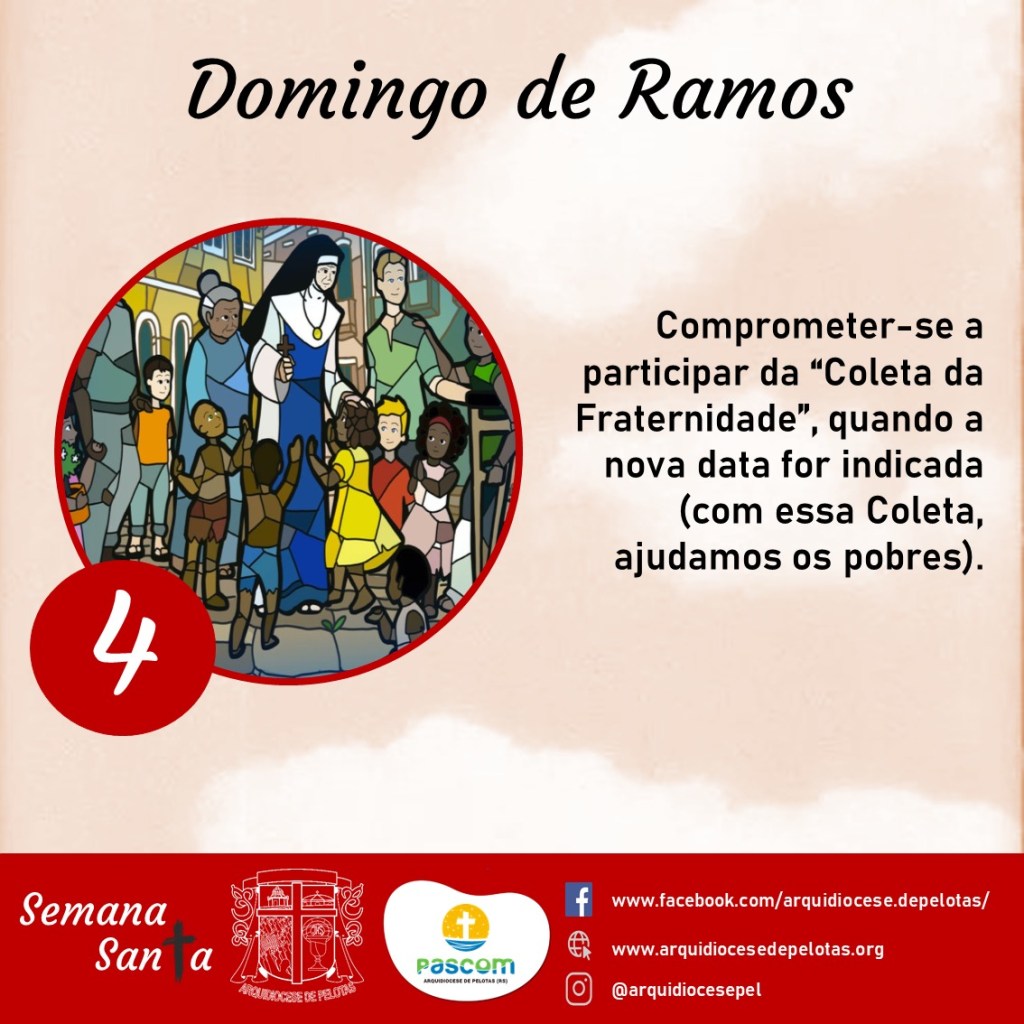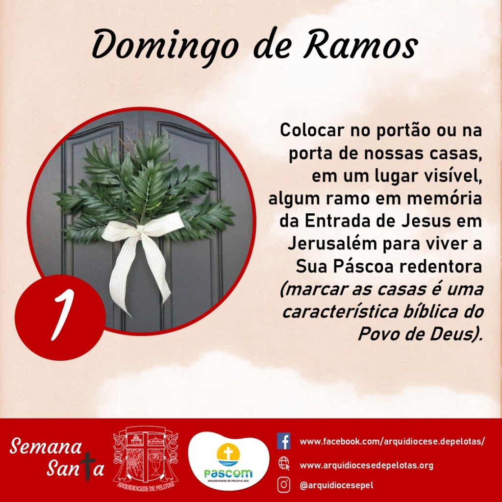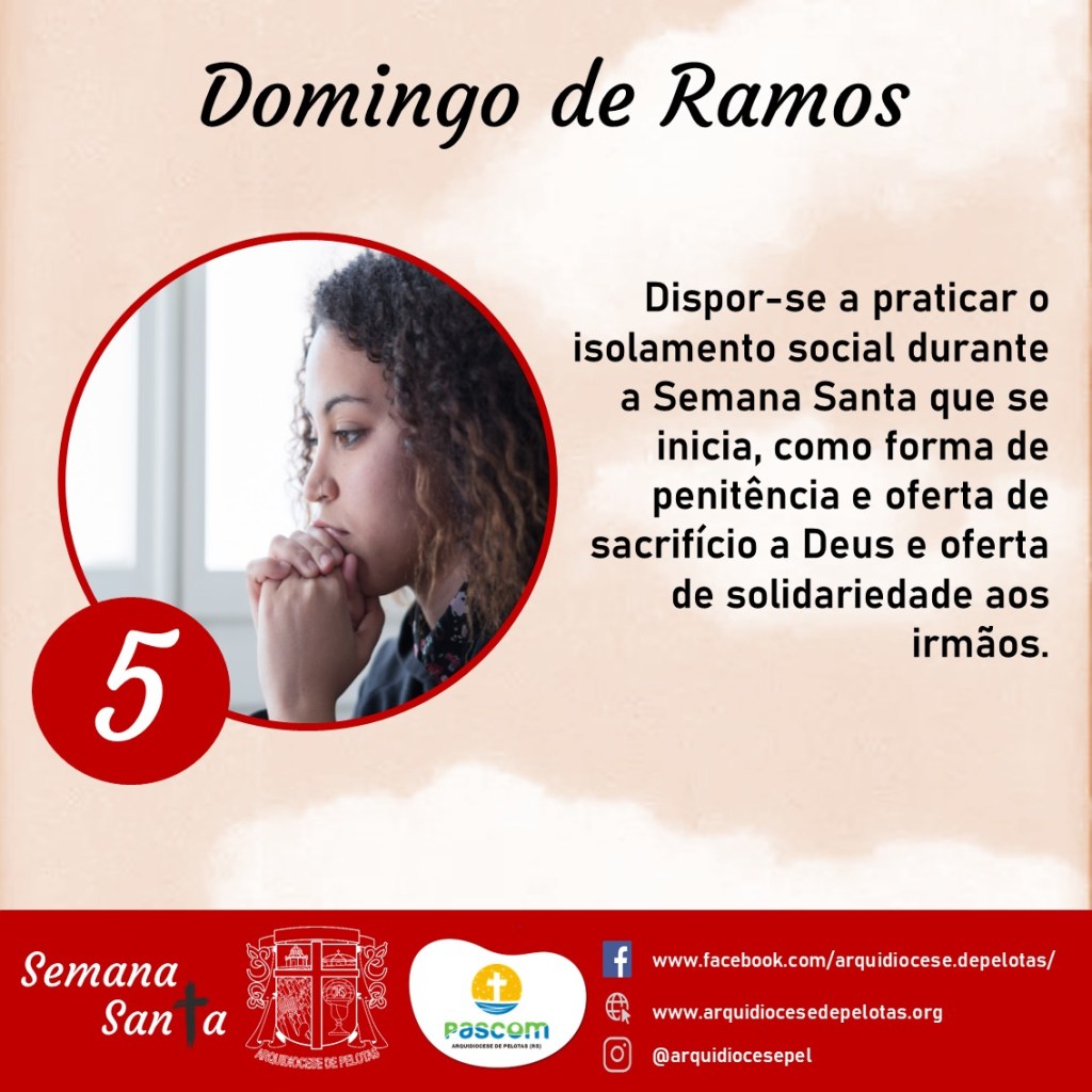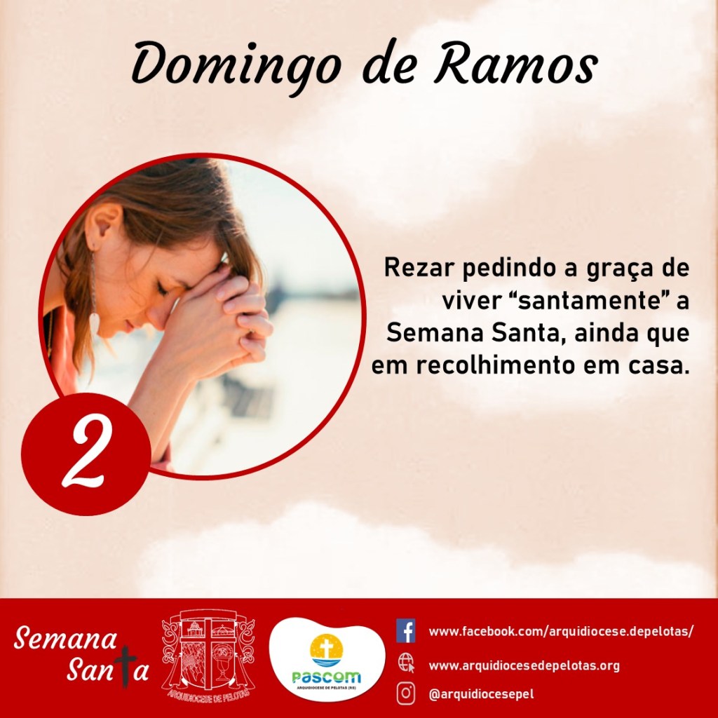 A Semana Santa e o Tríduo Pascal – constituídos pelo Domingo de Ramos (Domingo Santo), pela Missa da Ceia do Senhor (Quinta-Feira Santa), a Ação Litúrgica da Paixão (Sexta-Feira Santa) e a Vigília Pascal (Sábado Santo) – deverão ser celebrados na Catedral Metropolitana e nas Igrejas Paroquiais, apenas pelo arcebispo, sacerdotes e sem a participação dos fiéis; os fiéis sejam avisados da hora do início das celebrações dos Mistérios Litúrgicos, de modo que possam unir-se em oração nas respectivas habitações.