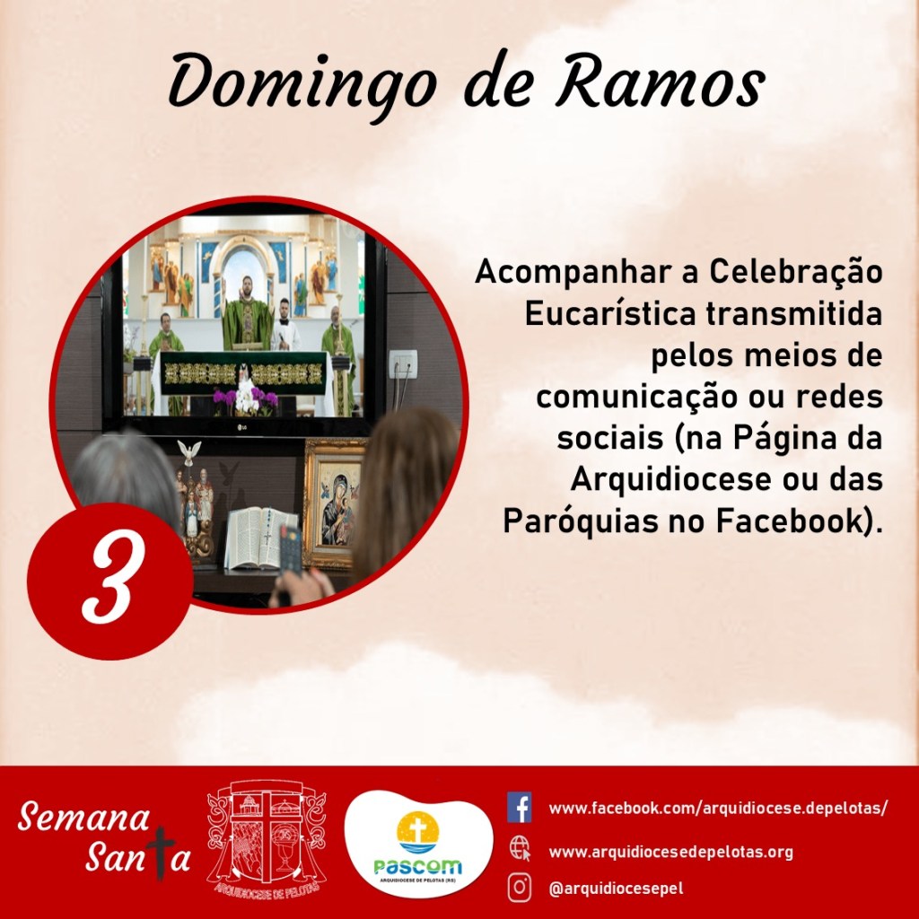 3.4. Propõe-se, especialmente na Semana Santa, além de estar em comunhão com as Celebrações Litúrgicas através dos meios de comunicação, a oração pessoal, a oração em família, a Leitura Orante da Palavra de Deus com a Lectio Divina, a reza do Rosário, a leitura de livros espirituais, o estudo da Doutrina Católica e de outros atos de cultivo da espiritualidade.