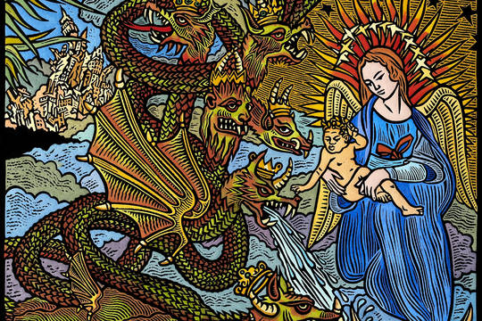 Voici la grande vision de la vie de l’Eglise au long de son chemin sur la terre. Car la femme de l’Apocalypse représente d’abord Sion, symbole de la ville de Jérusalem, symbole du peuple de Dieu, et donc aussi de l’Eglise. On comprend que le grand Dragon rouge veut absolument empêcher la naissance de l’enfant – le messie – mais ne peut rien ni contre lui, qui est enlevé au ciel (12,5) ni contre la femme, mise en sécurité au désert (12,6).