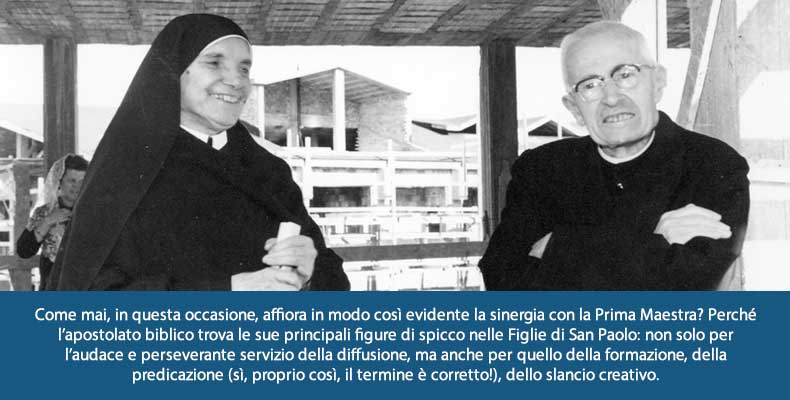 Come mai, in questa occasione, affiora in modo così evidente la sinergia con la Prima Maestra? Perché l’apostolato biblico trova le sue principali figure di spicco nelle Figlie di San Paolo: non solo per l’audace e perseverante servizio della diffusione, ma anche per quello della formazione, della predicazione (sì, proprio così, il termine è corretto!), dello slancio creativo.