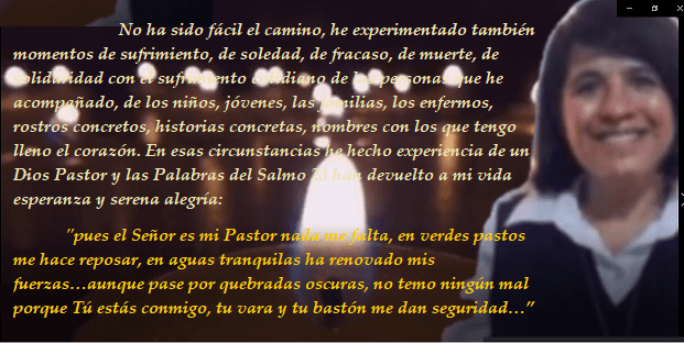 No ha sido fácil el camino, he experimentado también momentos de sufrimiento, de soledad, de fracaso, de muerte, de solidaridad con el sufrimiento cotidiano de las personas que he acompañado, de los niños, jóvenes, las familias, los enfermos, rostros concretos, historias concretas, nombres con los que tengo lleno el corazón. En esas circunstancias he hecho experiencia de un Dios Pastor y las Palabras del Salmo 23 han devuelto a mi vida esperanza y serena alegría: «pues el Señor es mi Pastor nada me falta, en verdes pastos me hace reposar, en aguas tranquilas ha renovado mis fuerzas…aunque pase por quebradas oscuras, no temo ningún mal porque Tú estás conmigo, tu vara y tu bastón me dan seguridad…”