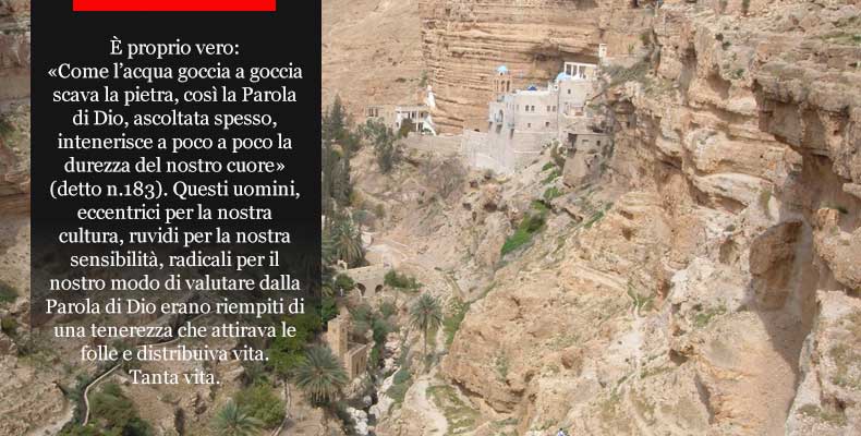 «Come l’acqua, goccia a goccia, scava la pietra, così la Parola di Dio, ascoltata spesso, intenerisce a poco a poco la durezza del nostro cuore» (detto n.183). In questo detto del padre Poemen è racchiusa tutta la fiducia che i Padri del deserto avevano nella forza della Parola, considerata, insieme all’umiltà, come l’arma più potente in grado di mettere in fuga il demonio. Epifanio non esita a dire che «il solo vedere la Bibbia ci rende più esitanti di fronte al peccato e ci dà maggiore vigore a compiere la giustizia» (detto n.8). A chi si rattrista per la propria ignoranza e incapacità nel comprendere le Scritture, Origene risponde: «L’incantatore di serpenti non conosce il valore delle parole che pronuncia, ma la bestia ascolta e lo conosce e si sottomette e si umilia. Così è di noi; se anche ignoriamo il senso delle parole che diciamo, i demoni ascoltano e si allontanano con terrore» (Pelagius et Johannes V,32). Un altro anziano paragona la pecora che rumina l’erba dolce per contrastare il bruciore delle spine del deserto a colui che “rumina” le Scritture per contrastare l’attacco dei demoni.