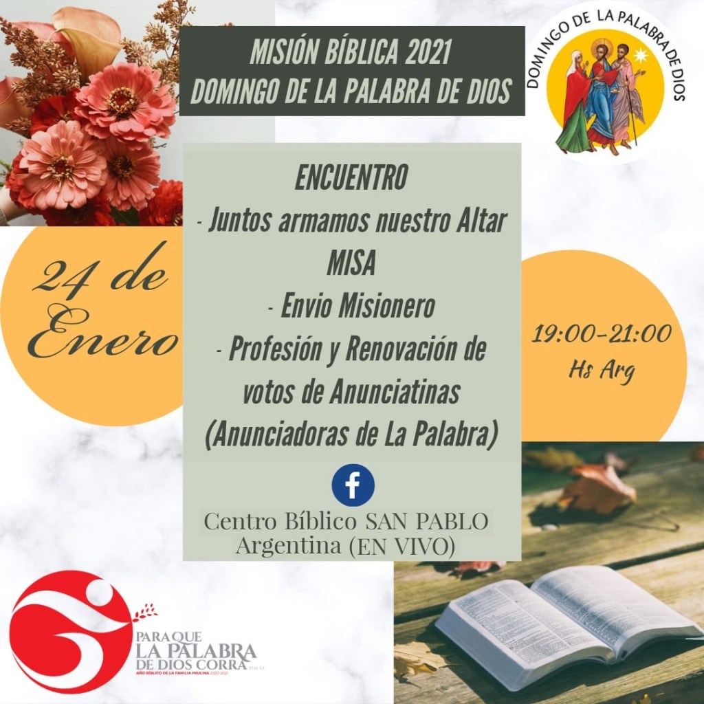 Desde el 25 al 30 de enero, a las 20 -hora Argentina-, toda la Misión Bíblica bajo el lema “Con la Palabra, salimos al encuentro” podrá seguirse desde la página de Facebook de los Cooperadores Paulinos Amigos de Jesús Buen Pastor, mientras que, la celebración del Domingo de la Palabra de Dios, será a través del Facebook del Centro Bíblico San Pablo de Argentina, desde las 19:00 horas de Argentina.