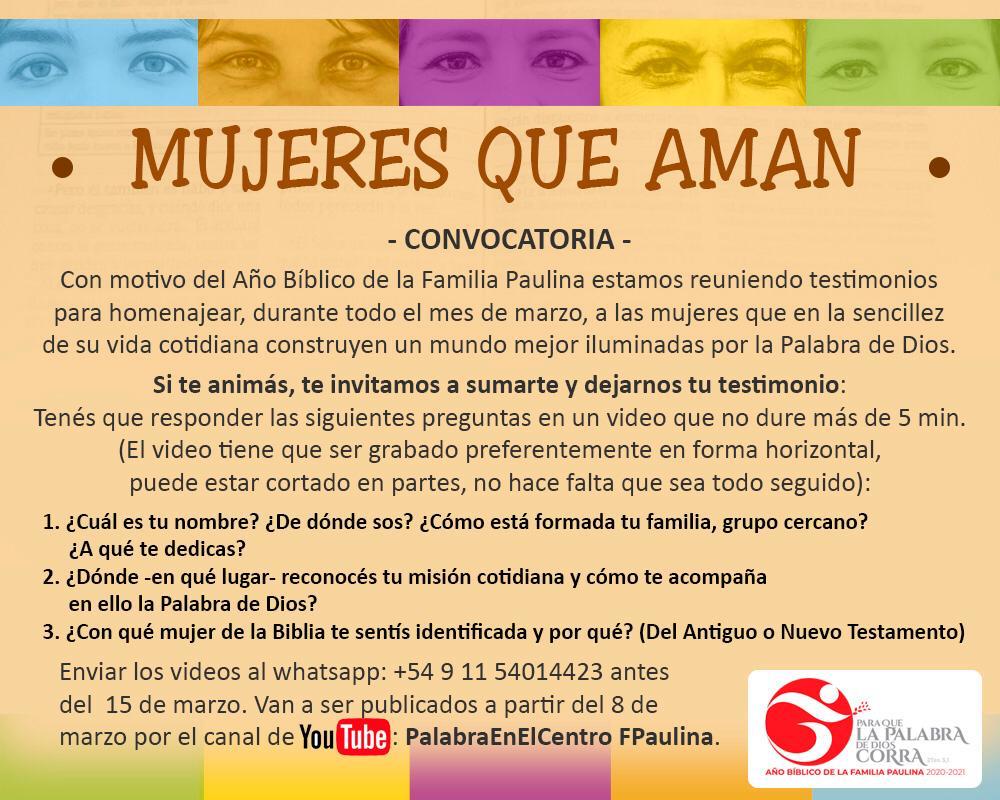 En el marco del Año Bíblico y como parte de las iniciativas que viene llevando adelante la Familia Paulina, se presenta esta memoria celebrativa preparada para esta ocasión denominada “Mujeres que aman”.