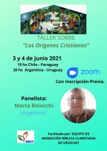 Taller sobre «Los Orígenes Cristianos» junto a Marta Boiocchi, Argentina. Nuevo taller a través de la plataforma Zoom, Facilitado por: Equipo de Animación Bíblica Claretiana de Uruguay Inscribite haciendo clic en el enlace y recibí toda la información por correo electrónico: https://docs.google.com/forms/d/e/1FAIpQLSdDvH3OwlGWsplu5WgZ_q5y_g_w8Fg83Ohw9Ka0B8477d0SoQ/viewform Anteriores: