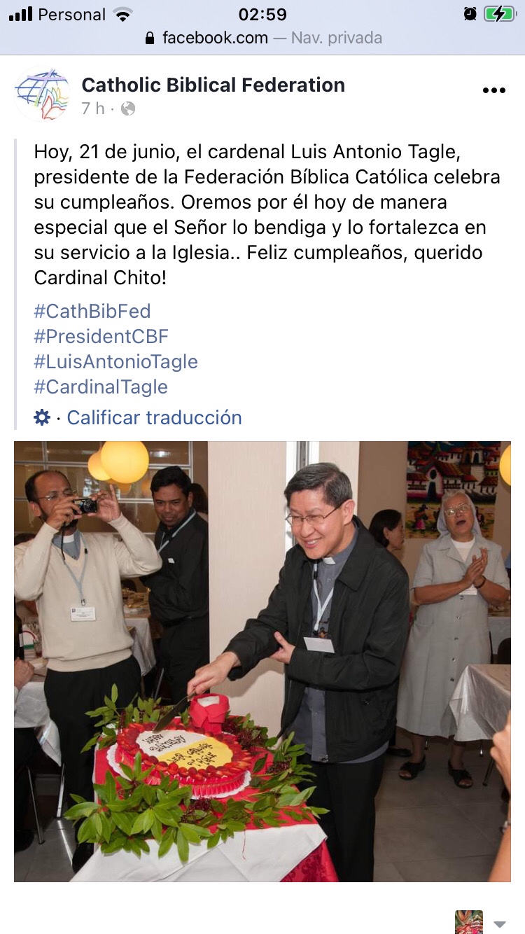 Cumpleaños del Cardenal Tagle, presidente de la FEBIC 21/06/2021Comunicacion Cumpleaños del Cardenal Tagle, presidente de la FEBIC Comparte esto:Tweet Haz clic para enviar un enlace por correo electrónico a un amigo (Se abre en una ventana nueva) Correo electrónico Haz clic para compartir en WhatsApp (Se abre en una ventana nueva) WhatsApp Haz clic para imprimir (Se abre en una ventana nueva) Imprimir Más Haz clic para compartir en Telegram (Se abre en una ventana nueva) Telegram Me gusta Cargando... Relacionado