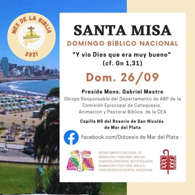 El próximo 26 de septiembre el Obispo de Mar del Plata y Asesor del Departamento Nacional de Animación y Pastoral Bíblica de la CEA (DeNAPBi), Mons. Gabriel A. Mestre, presidirá en la Capilla Nuestra Señora del Rosario de San Nicolás de Mar del Plata la misa del Domingo Bíblico Nacional que será transmitida por Facebook.com/Diócesis de Mar del Plata y por Canal Telefé de dicha ciudad a las 10 hs.
