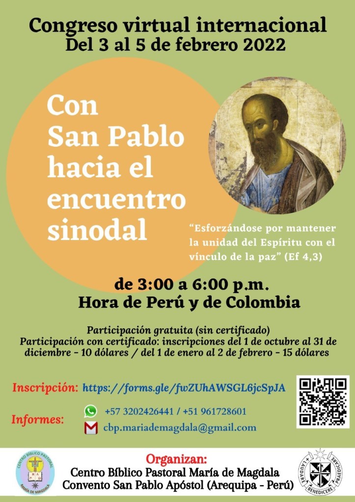 El Centro Bíblico María Magdalena y el Convento San Pablo Apóstol de Arequipa – Perú invitan, en el marco de la preparación del sínodo sobre la sinodalidad, a un congreso tal como aparece especificado en el afiche adjunto.