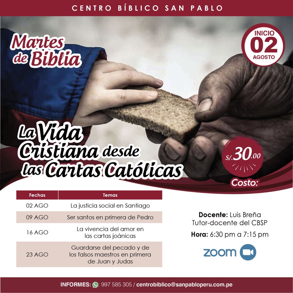 Del 2 al 23 de agosto próximo, el Centro Bíblico San Pablo de Lima (Perú) ofrece un curso en español que explora dos de las siete cartas católicas (1 Jn y Judas) escuchando a las primeras comunidades cristianas y dejando algunos principios de la auténtica vida cristiana.