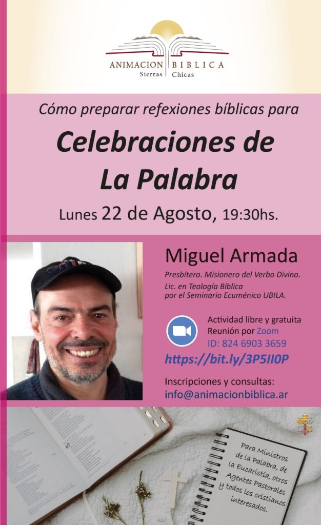 La actividad se realizará el día lunes 22 de agosto a las 19,30 horas y estará a cargo de Miguel Armada, Presbítero, Misionero del Verbo Divino y Licenciado en Teología Bíblica por el Seminario Ecuménico UBILA.
