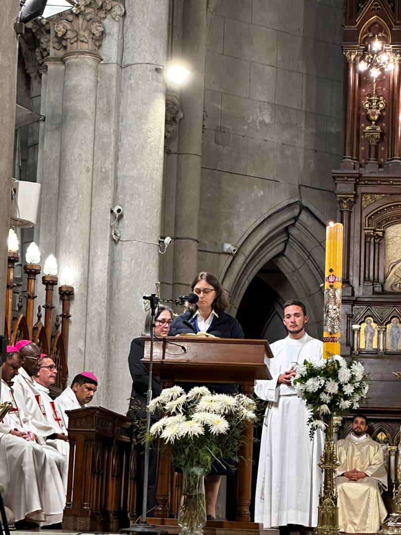 En su homilía, el obispo Gabriel Mestre dio la bienvenida a los presentes y agradeció a Dios “porque estamos reunidos en clave sinodal de diversas partes del mundo para proclamar que la Palabra de Dios es fuente de vida para un mundo frágil”.